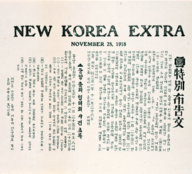 「신한민보」특별 포고문(1918.11.28.) 1차 세계대전이 끝난 후 북미지방총회는 윌슨 대통령에게 승전치하서를 보내고 시국문제에 대한 건의서를 중앙총회에 제출했다.